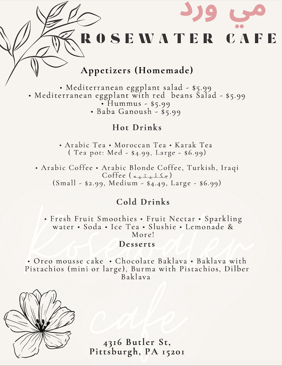 Rosewater Cafe specializes in homemade appetizers, including the rich Baba Ganoush and flavorful Hummus, each priced at just $5.99. The menu extends to an impressive selection of hot drinks—try the aromatic Karak Tea or the robust Arabic Coffee, both at $5.49, providing warmth and comfort.